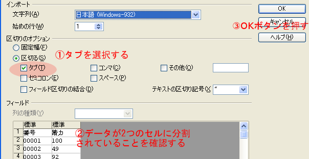 - テキストのインポートメニューが表示されるので、区切りのオプションを「タブ」にしてOK