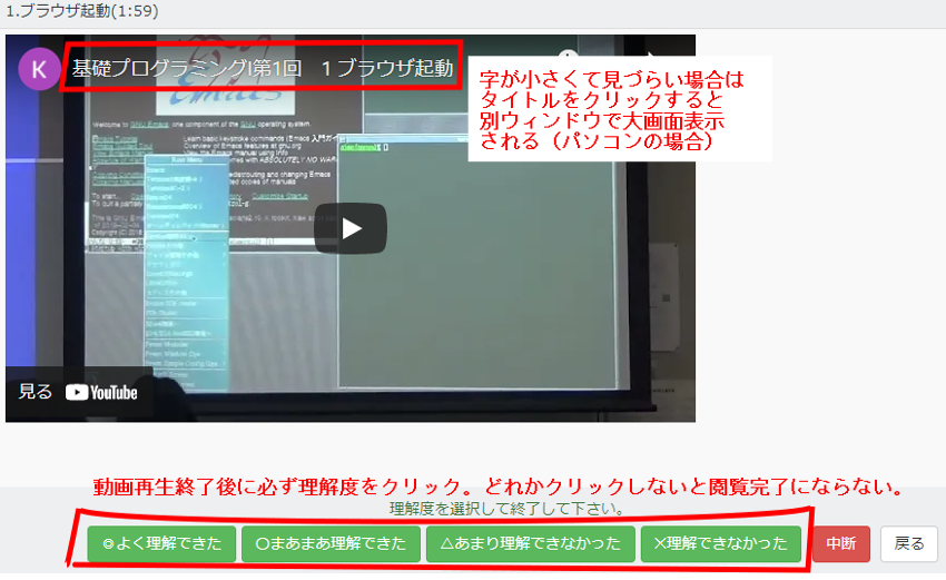 映像が小さくて見づらい場合は、タイトルをクリックすると別ウィンドウでサイズが大きめな動画を再生できる(パソコンの場合)。この場合は理解度のクリックを忘れがちになる。必ず映像を視聴した後で理解度をクリックする。